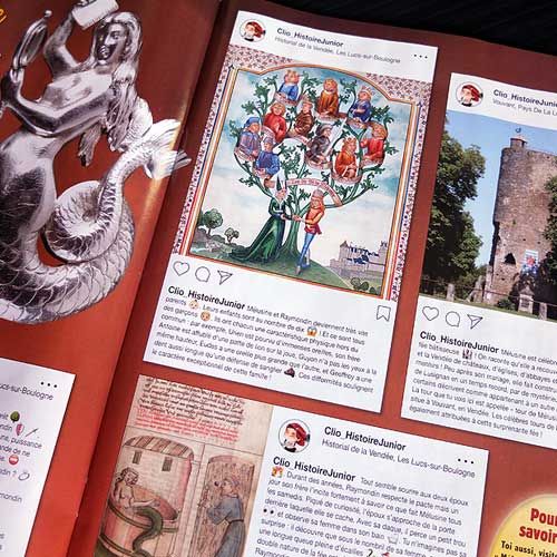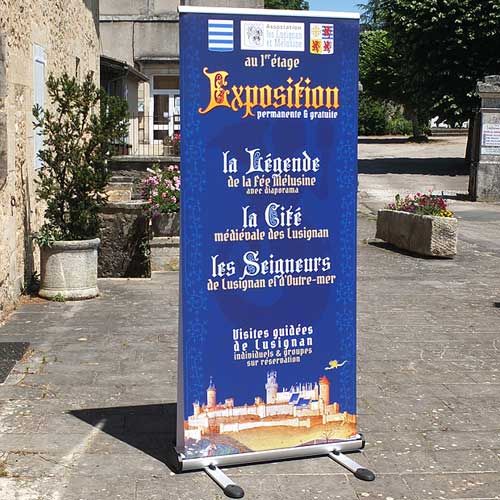 Lorsque ma collaboration avec l'association « Les Lusignan et Mélusine » a débuté, c'est avec respect et enthousiasme que j'ai voulu retranscrire la célèbre légende. C'est donc à partir des textes confiés par l'association que j'ai créé les nombreux panneaux de l'exposition permanente. Un graphisme s'inspirant des nombreuses images illustrant le livre de Jean d'Arras ainsi que des parchemins et documents de son époque moyenâgeuse.