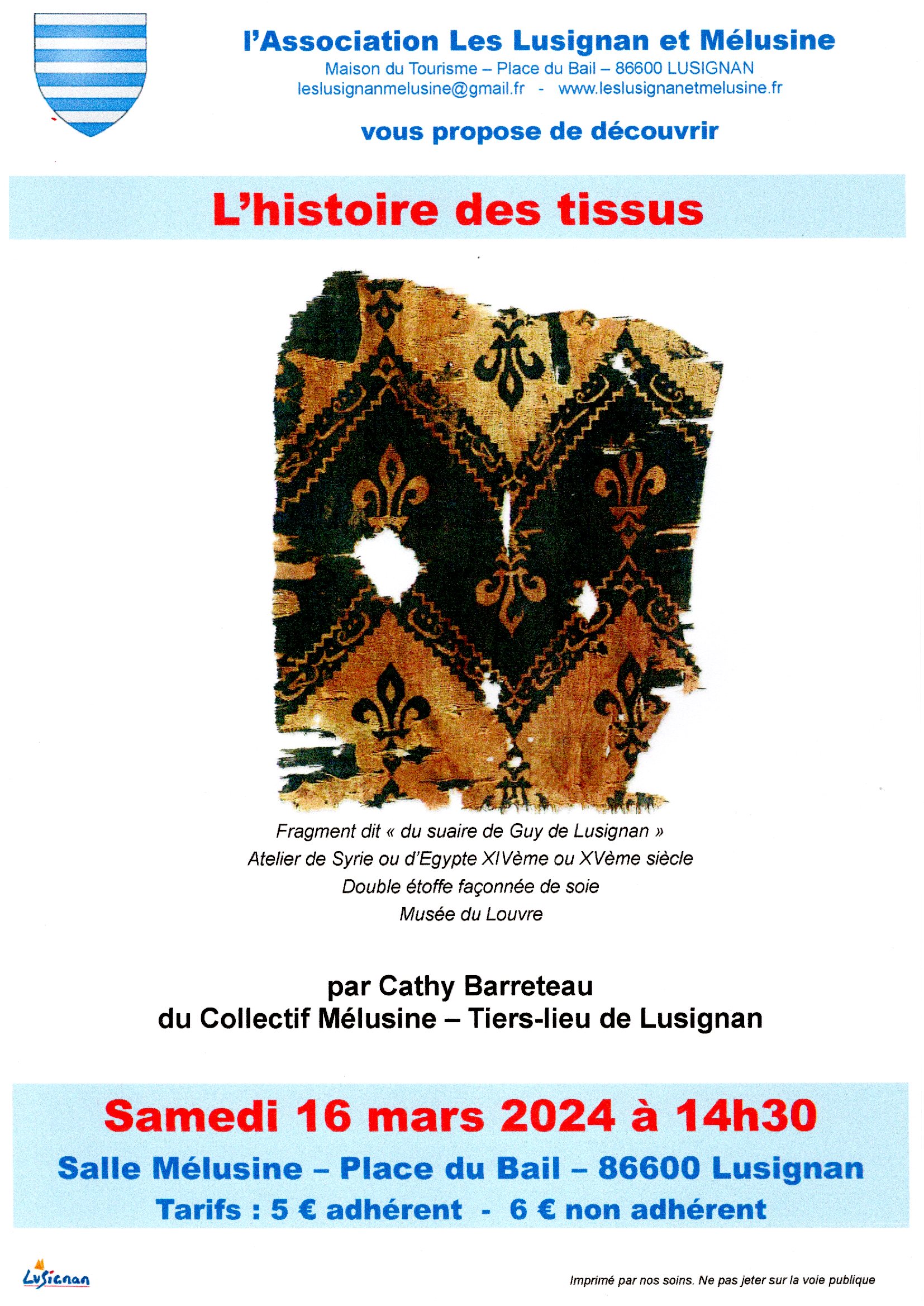 L'association les Lusignan et Mélusine vous propose de découvrir l'histoire des tissus par Cathy Barreteau du Collectif Mélusine le samedi 16 mars 2024 à 14h30
