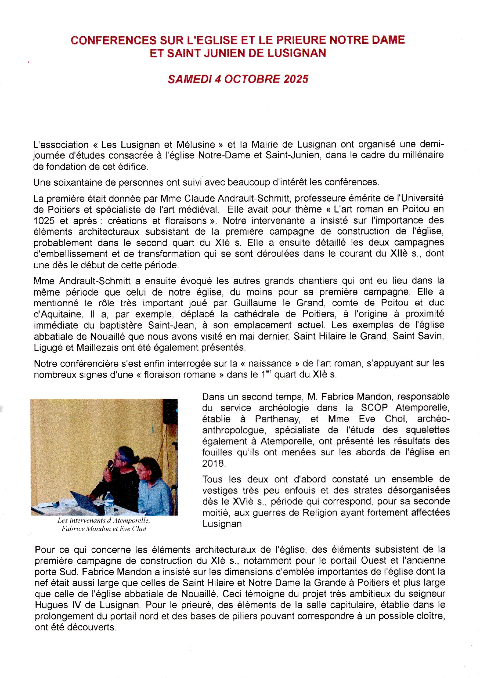 Conférences sur l'église Notre-Dame et Saint Junien de Lusignan en 2025